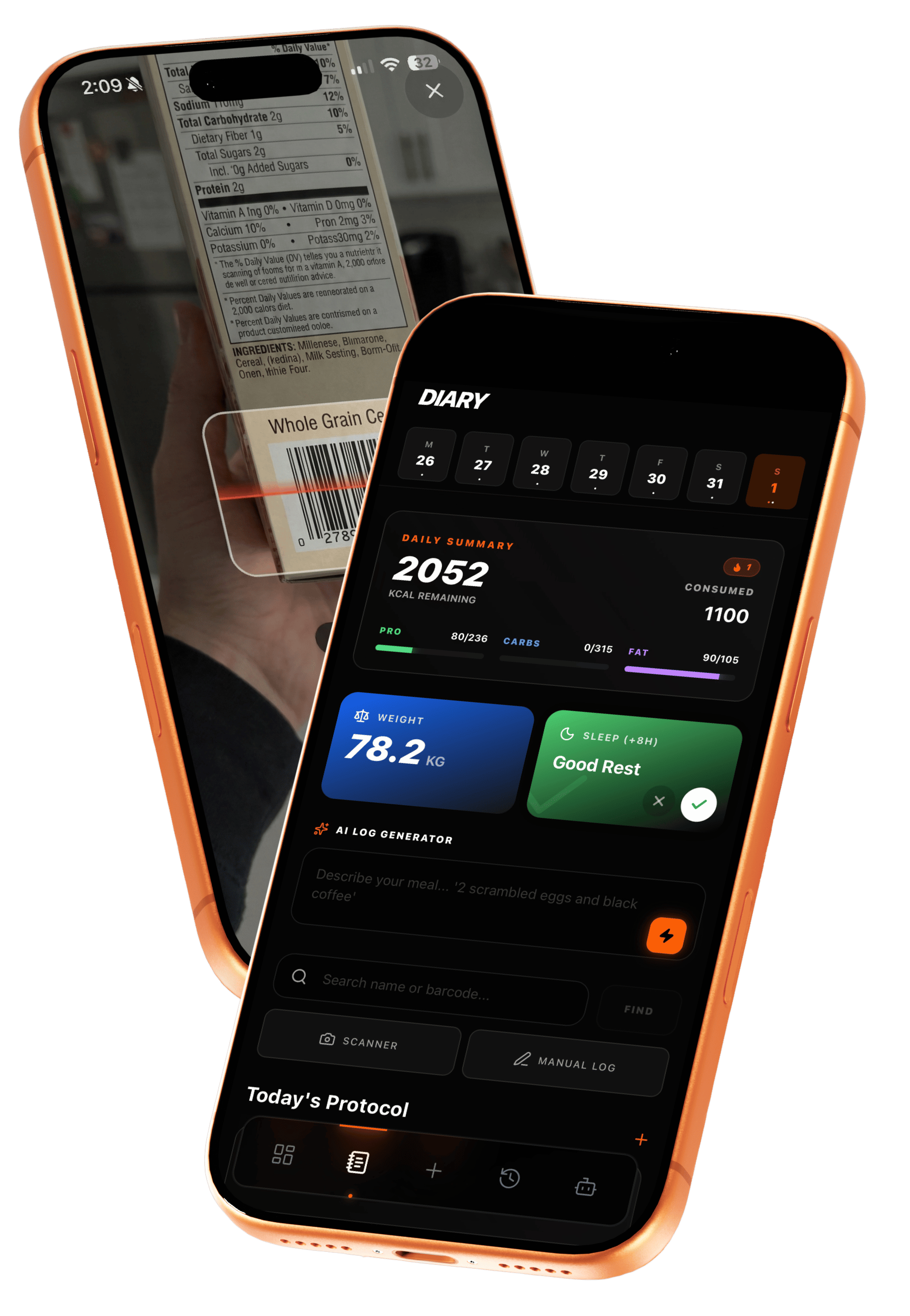 Precision tracking without the friction. Just describe your meal, scan a barcode, or log manually. We handle the rest.